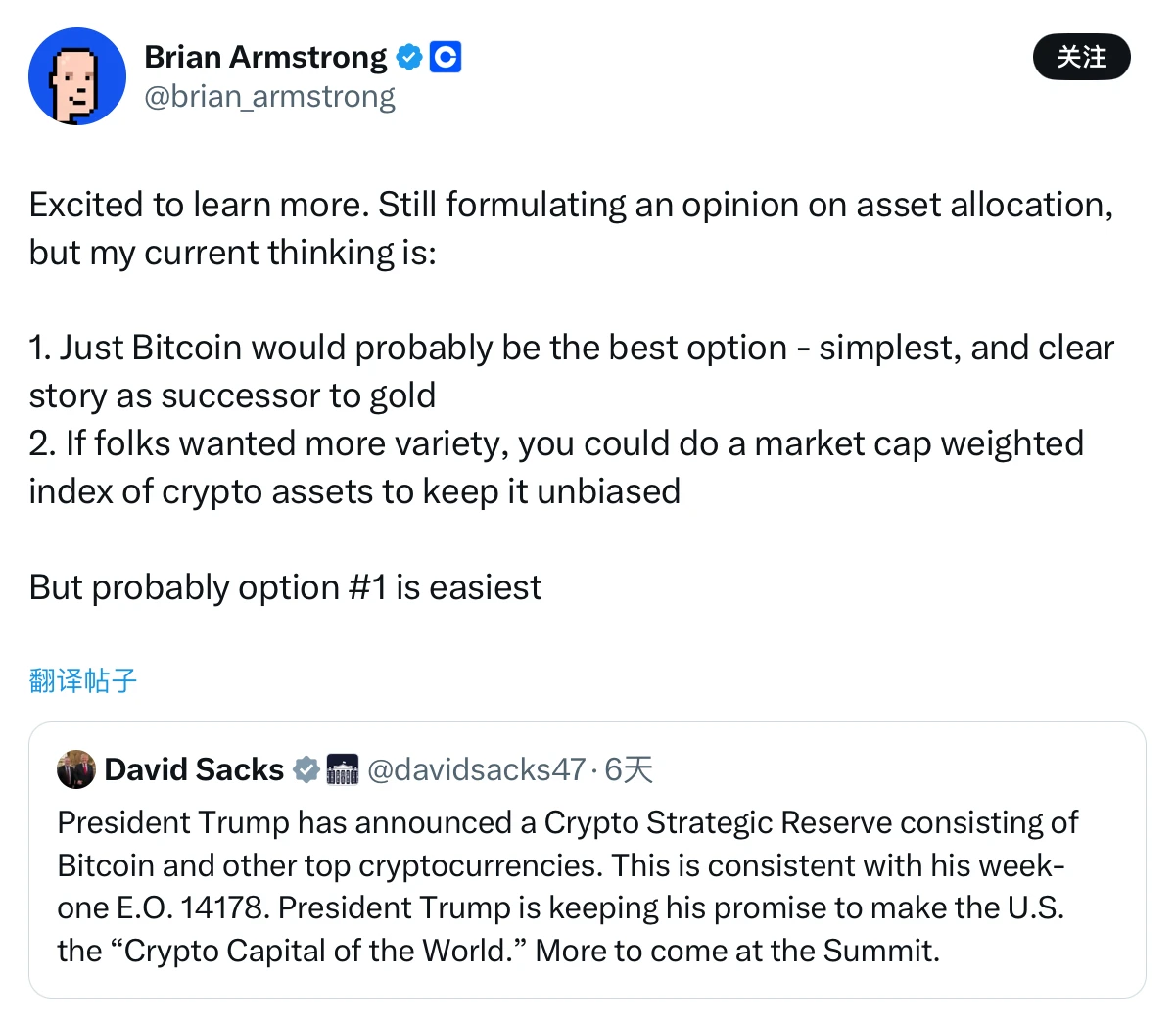 3 月 3 日消息,Coinbase 联合创始人兼 CEO Brian Armstrong 在社交媒体上针对“特朗普正推进加密货币储备计划”一事发表评论称,就战略储备的资产配置而言,比特币可能是最好的选择,作为黄金的继任者,比特币有着最简单、最清晰的叙事。如果人们想要更多种类,可以对加密资产进行市值加权指数以保持公正。但可能只选择比特币,才是最简单的。