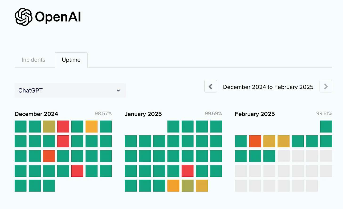 然而,AI工具在消费者中的广泛使用对现有的电力基础设施造成了巨大压力。大规模语言模型(LLM)需要大量的计算资源,而高用户流量往往会导致服务中断。OpenAI过去三个月的服务可用性热图显示,频繁出现拥堵。