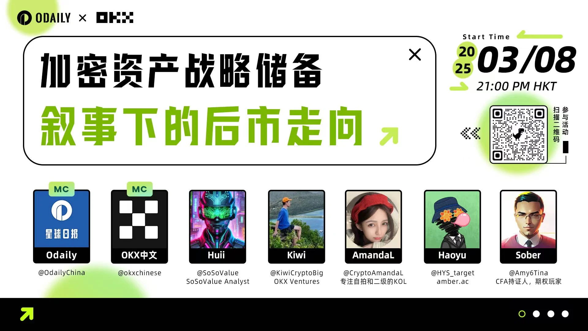 3月8日晚,Odaily星球日报联合 OKX 邀请四位加密行业研究员和 KOL,共同探讨加密资产储备及其对后市的影响,嘉宾分别是:SoSoValue 分析师 Huii、KOL Amanda、Amber 研究员 Haoyu、期权交易玩家 Sober。 首先,先请嘉宾自我介绍。