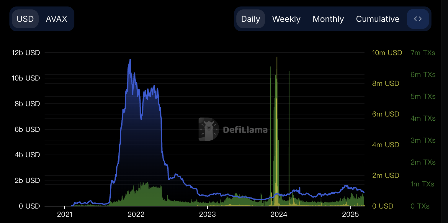 根据DeFiLlama数据显示,截至3月11日,Avalanche的TVL约为10.2亿美元,较历史高点骤降约91.1%。与此同时,Avalanche的日交易笔数从2023年636万笔锐减至当前的42.7万笔,日收入也从2023年底的972万美元下滑至约为6万美元。尽管Avalanche生态的衰退并非孤立现象,更是当前加密市场整体疲软的缩影,但这一连串数据仍反映出,Avalanche的生态规模和经济活跃度正面临着严峻挑战。