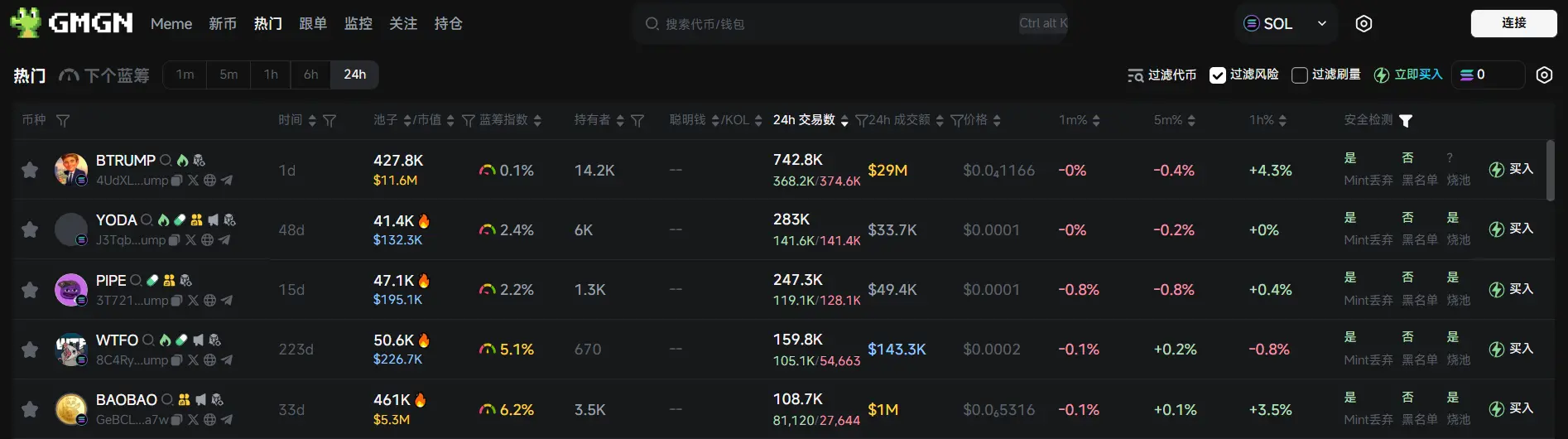 过去 24h Solana 热门代币前五依次为:B TRUMP、 YODA、PIPE、WTFO、BAOBAO