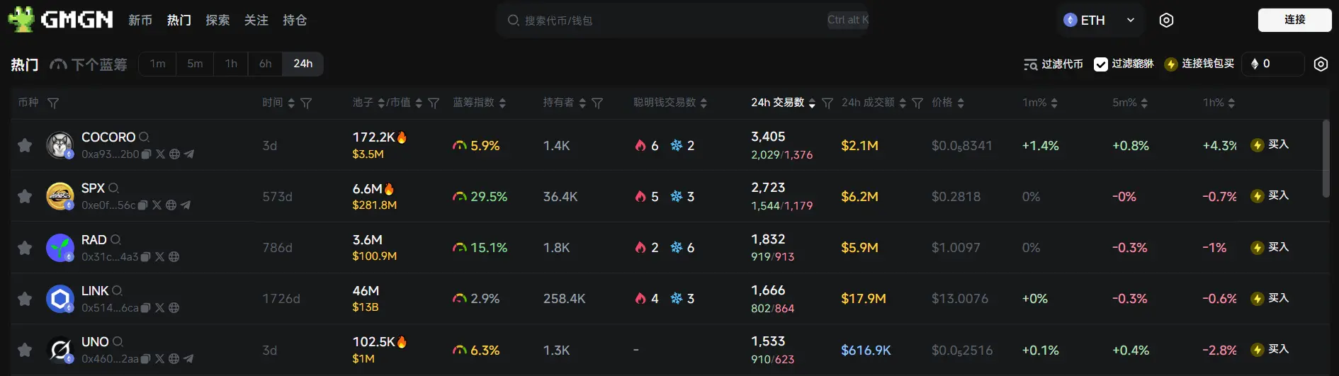 过去 24h 以太坊热门代币前五依次为:COCORO、SPX、RAD、 LINK、UNO