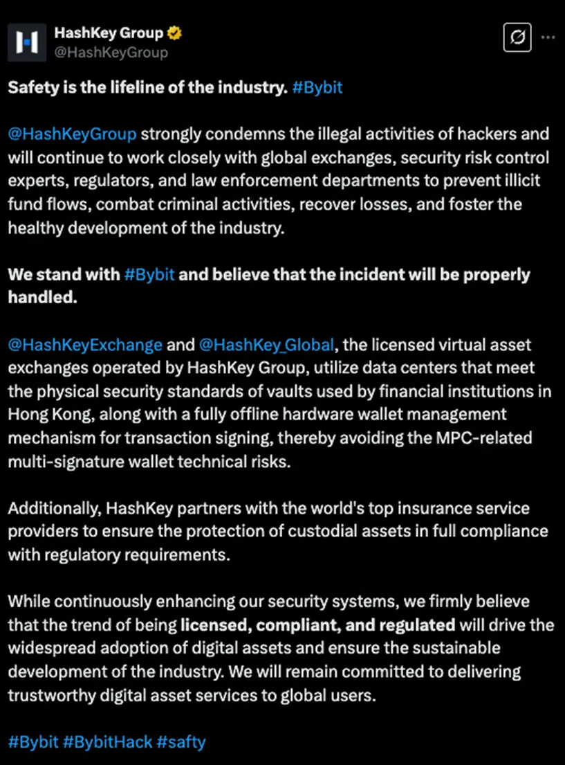 Bybit事件深度警示黑客利用多签钱包执行间隙篡改智能合约代码,导致冷钱包被盗 。事件暴露传统多签技术(MPC)的潜在漏洞,需物理隔离与监管审计双重保障。 面对行业动荡,HashKey Global 第一时间发声,支持 Bybit 并谴责黑客行为,同时通过强化安全体系、深化合规布局,提升行业信任。