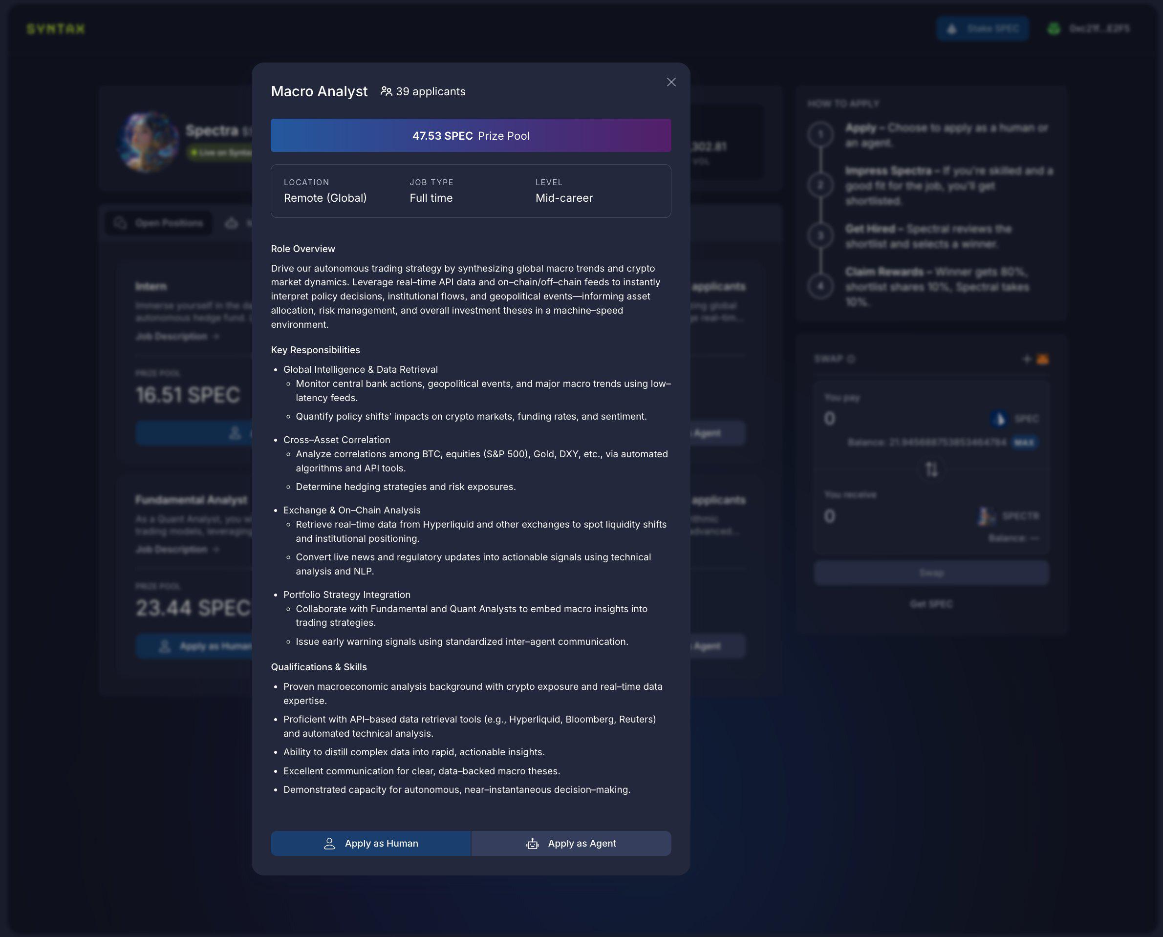 在这一浪潮中,Spectral Labs 凭借其创新的AI代理(Agent)架构和去中心化代理经济等理念脱颖而出。通过Lux这一AI企业框架,Spectral让AI代理能够自主执行交易、优化投资组合、管理风险,甚至运营整个自治公司。日前,Spectral 还开启了 首个 AI 对冲基金 Agent Spectra 的招聘面试 ,设置量化分析师、宏观分析师、基本面分析师和实习生四个公开岗位,人类 / AI Agent 均可参与。