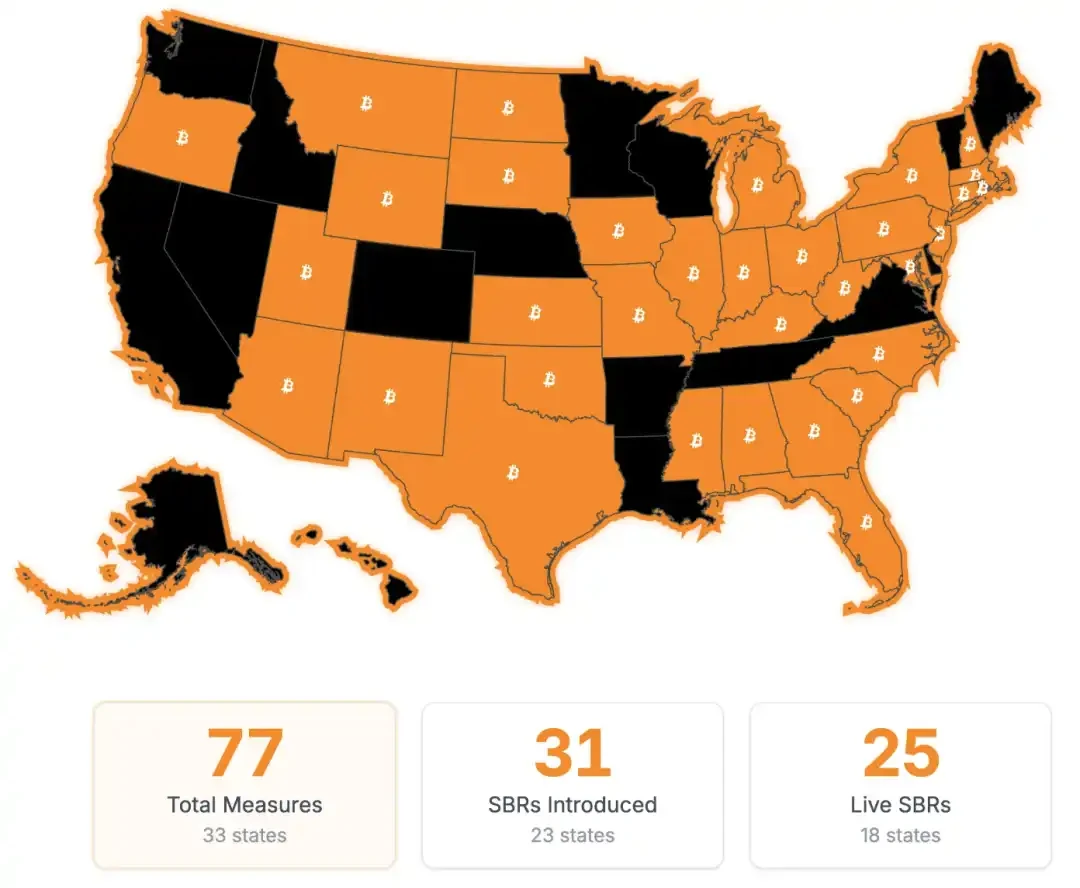 美国各州政府在积极推动 Startegic Bitcoin Reserve Act (比特币储备基金)的立法进程现状(黄色代表支持,黑色代表反对)