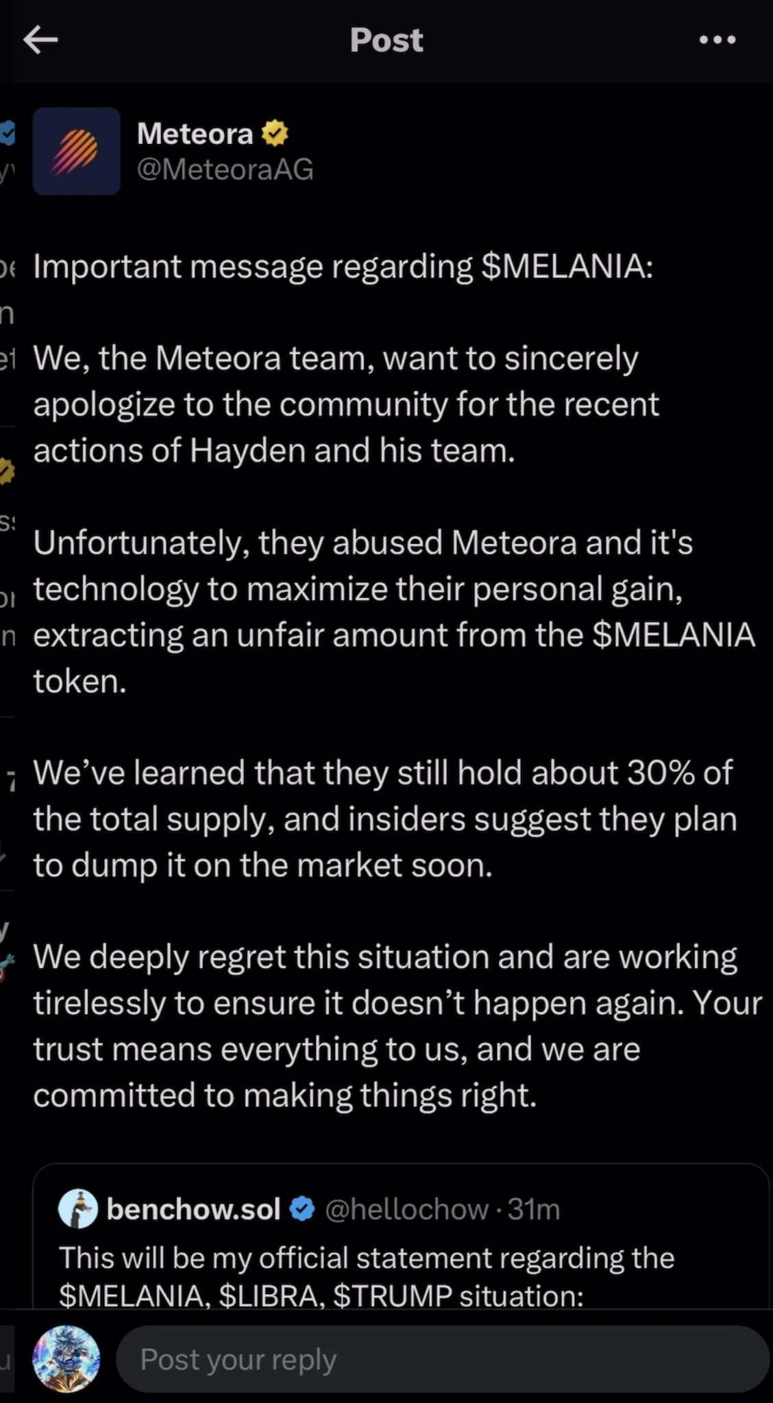 Ben Chow 的个人账户发声后不久(大概是 8: 42 左右),Meteora 的官方账户对此进行了转发评论, 对 MELANIA 代币发行过程中的存在的不公平行为进行了道歉,并表示“他们仍持有 30% 的 MELANIA 代币,准备砸盘”。