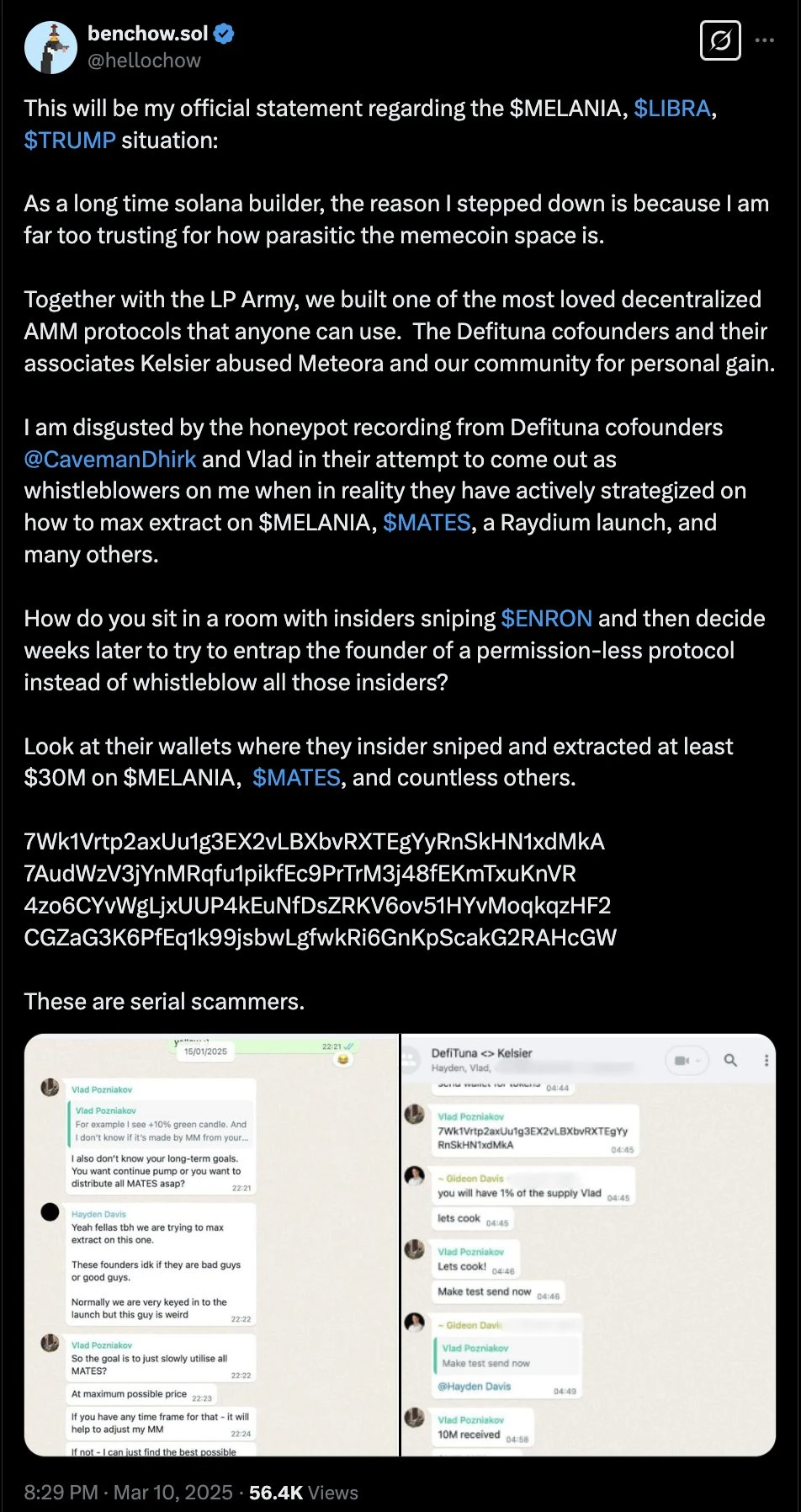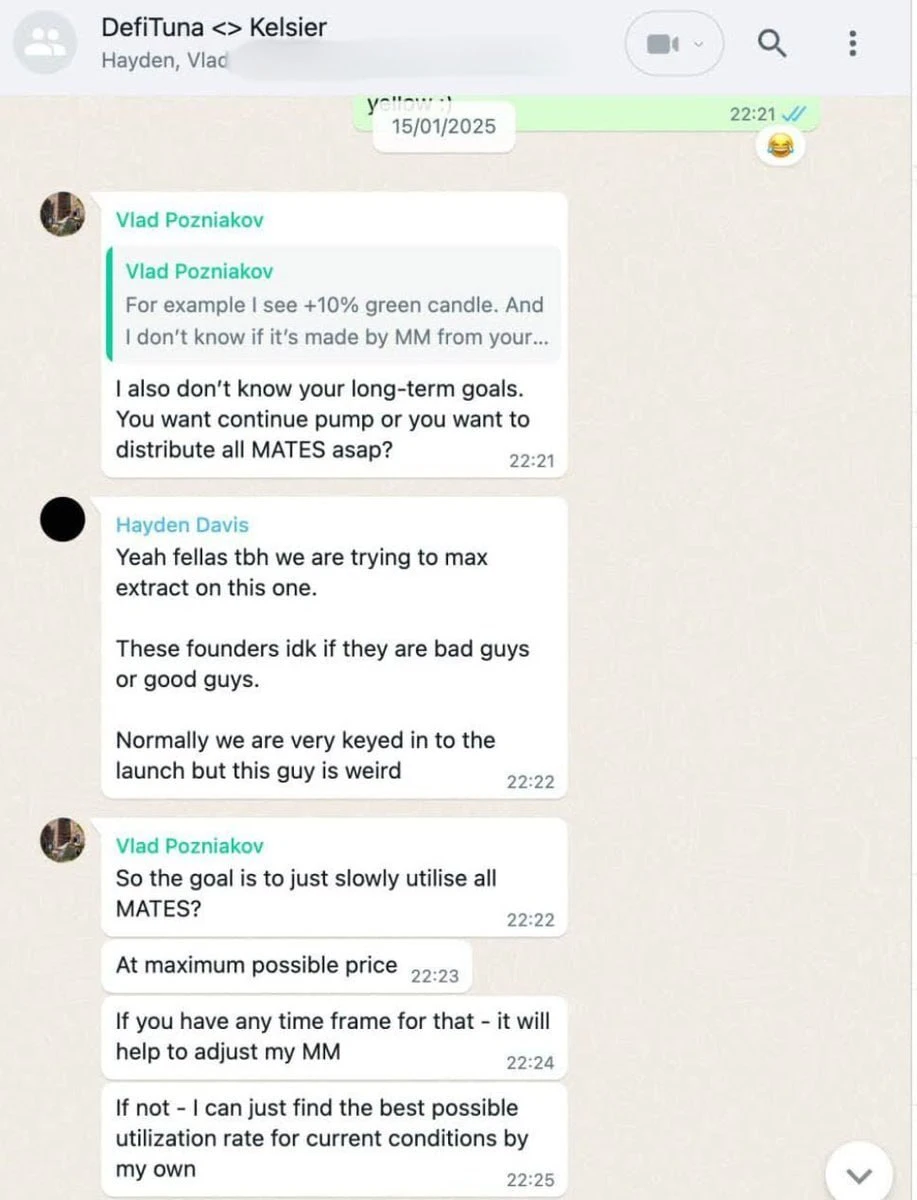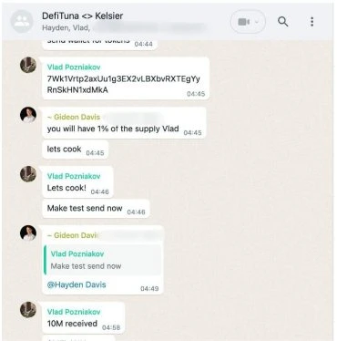 Odaily 注:Ben Chow 贴出的聊天记录(都是社区截图,所以略糊),对话方包括 DefiTuna 联合创始人 Vlad、Kelsier 首席执行官 Hayden Davis,以及另一未知人士 Gideon Davis。