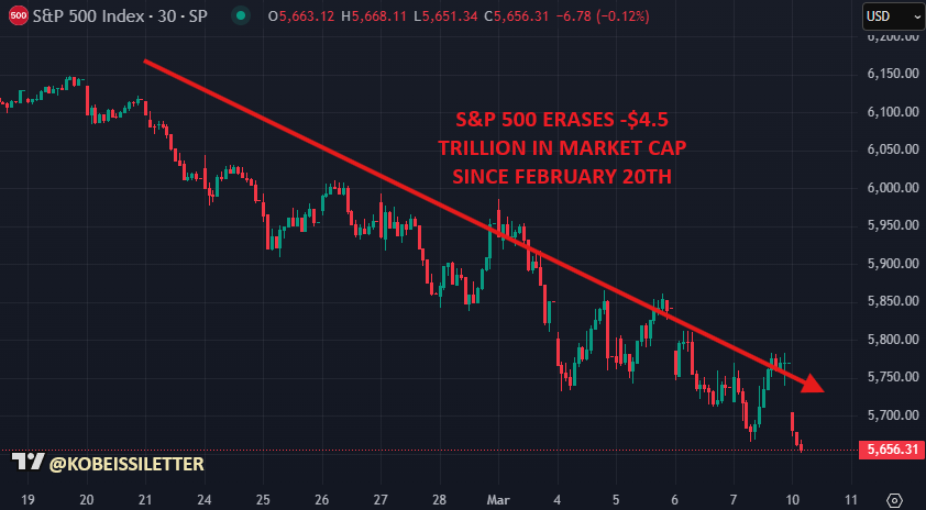自2月20日以来,标准普尔500指数已抹去了惊人的4.5万亿美元市值。