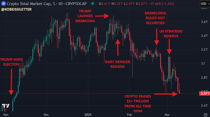 即使几乎所有特朗普的看涨承诺都已实现,加密货币市场仍然下跌超过1万亿美元。