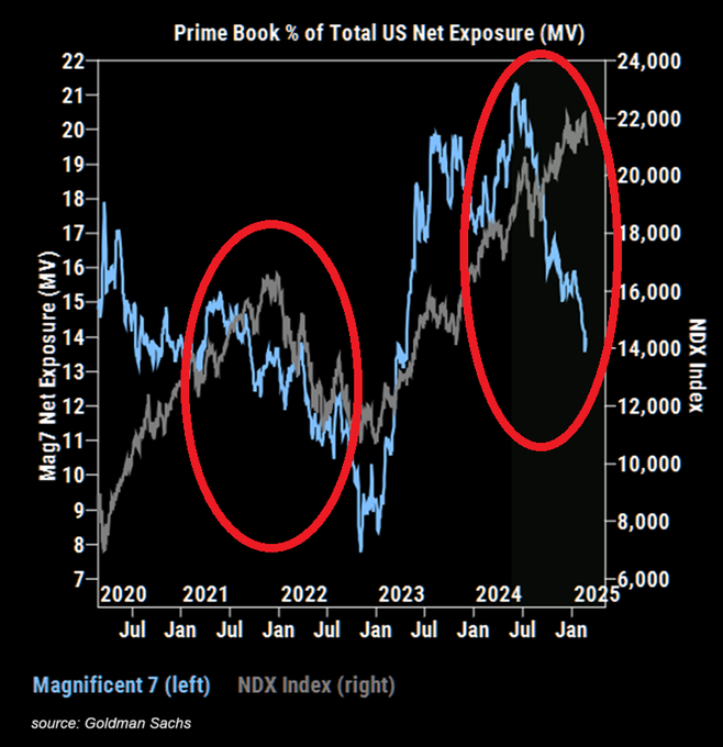 进入2025年,对“七大巨头”股票的对冲基金敞口降至22个月来的最低点。