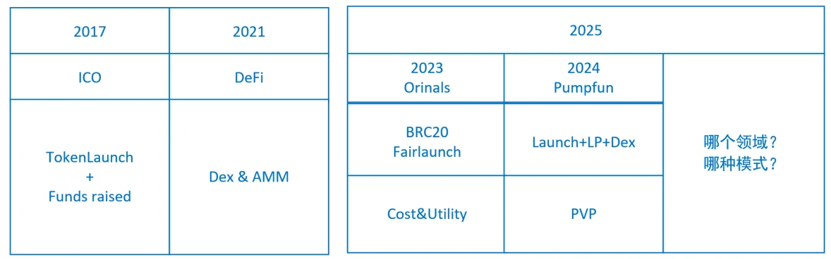 2023 年的铭文与 2024 年的 pumpfun 现象是一些牛市可能爆发的现象。如果能够解决铭文与 pumpfun 本身的问题,有更完善的模式产生,在某些领域有可能会促成牛市的爆发。大概率还是和发资产、交易资产相关。