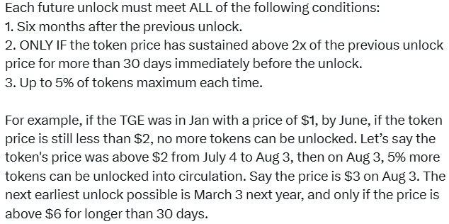 (3)项目团队有权推迟或减少每次解锁的规模。如果他们不想卖出更多,他们不必这样做。但每次他们最多可以卖出(解锁) 5% ,然后他们必须等待至少 6 个月,价格再次翻倍。 (这个设计必须要 DAO 这样第三方的机构来做,把团队有权做,变成 DAO 有权决定做。因为项目团队也是 DAO 的重要成员,应该不会产生过多的副作用)