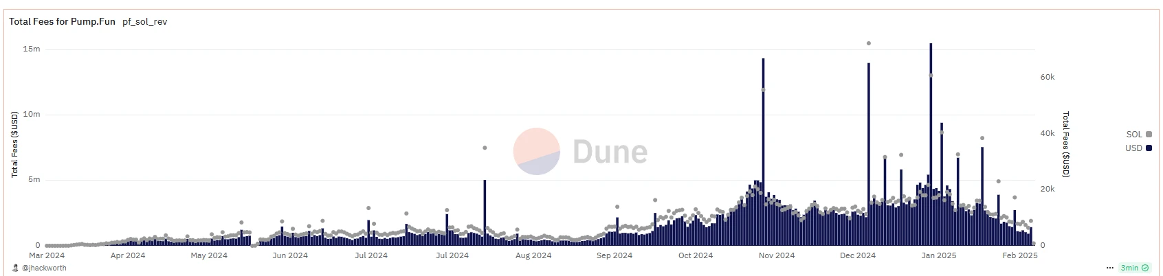 Pumpfun 的总收入接近 6 亿美金,以至于美国总统 Trump 和其家人也发行了自己的代币,说明了 memecoin 的爆发与高潮期。从 Dune 上面的分析看,memecoin 也在经历一个从产生,到成长,到爆发的周期。