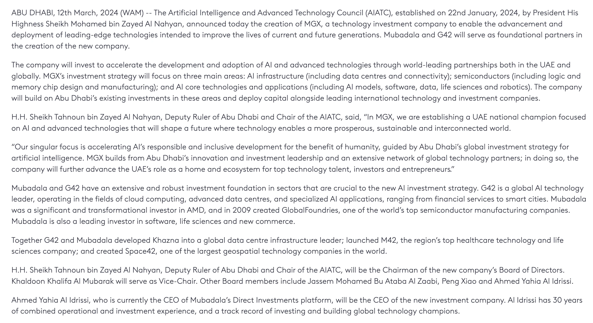 官方资料显示, MGX 成立于 2024 年 1 月 22 日,定位为一家技术投资公司, 专注于通过在阿拉伯联合酋长国和全球建立世界领先的合作伙伴关系来加速 AI 和先进技术的开发和采用。MGX 专注于在 AI 可以大规模提供价值和经济影响的领域里投资,包括半导体、基础设施、软件、技术支持的服务、生命科学和物理 AI。