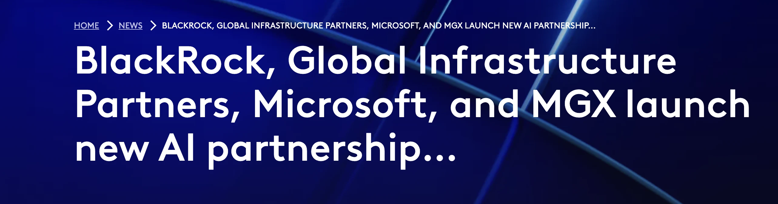 除此之外, 在 MGX 官方仅有的几篇公告中,还提到了 MGX 与贝莱德、微软、GIP 等多个巨头玩家之间的合作关系。