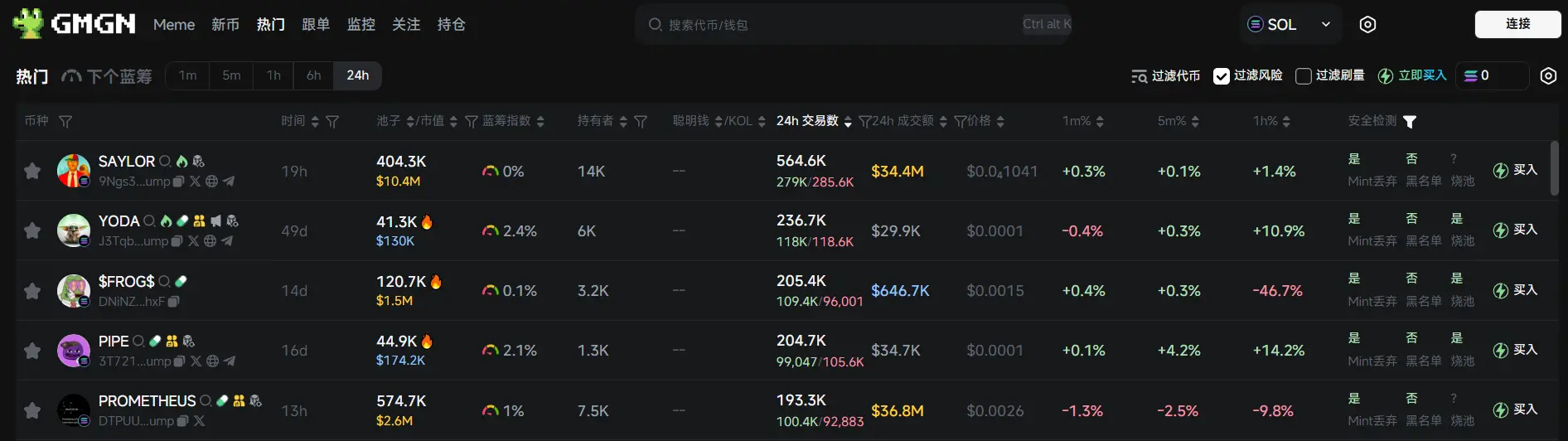 过去 24h Solana 热门代币前五依次为:SAYLOR 、 YODA、$FROG$、PIPE、PROMETHEUS