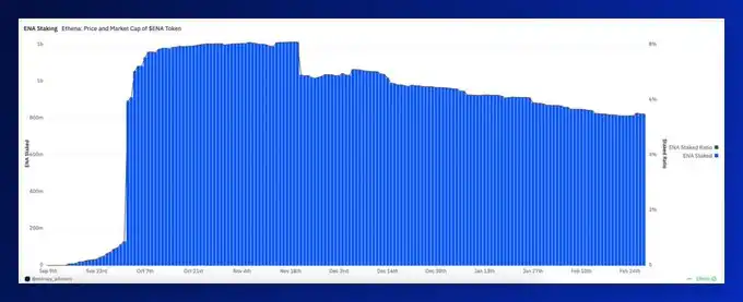 Ethena Labs 现已跻身 TVL 前五的 DeFi 协议,年收入超 3 亿美元。随着协议增长,Wintermute 提出的手续费分配提案 已获 Ethena 风险委员会 批准。目前,8.24 亿枚 ENA(价值 3.24 亿美元)处于质押状态,占总供应量的 5.5%,但 质押者仅能获得积分奖励和未领取的 ENA 空投,并未享受到 Ethena 产生的收入分成。