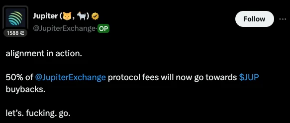 Jupiter 已开始使用其协议费用的 50% 回购 JUP 代币,并从 2025 年 2 月 17 日起锁定三年。 该计划旨在减少流通供应,增强长期稳定性,并提高 Solana 生态系统的参与度。