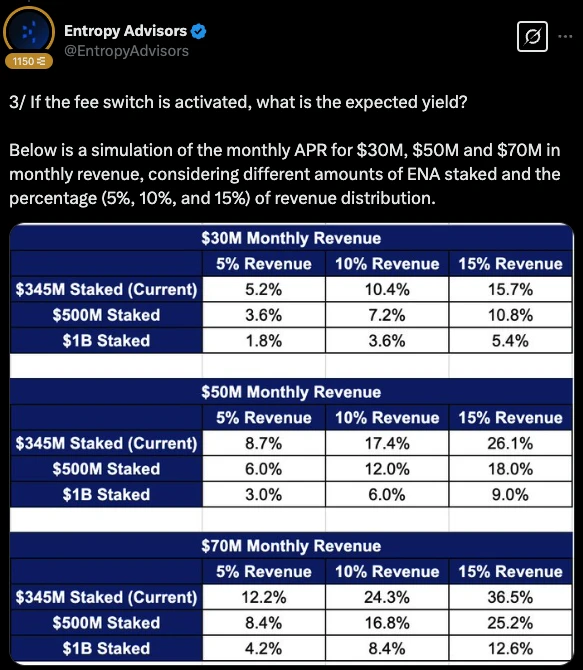 Ethena Labs 现在是 TVL 排名前 5 的 DeFi 协议之一,收入超过 3 亿美元。随着收入增长,Wintermute 提出的启用 ENA 费用转换提案已获得 Ethena 风险委员会的批准。