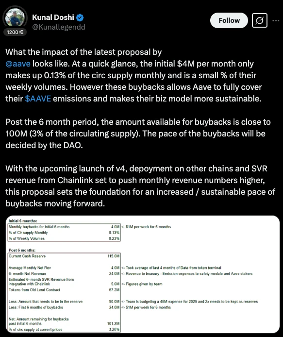 Aave 启动了一项为期六个月的回购计划,每周拨出 100 万美元(每月约 400 万美元)来控制 AAVE 通胀并使该协议更加可持续。六个月后,回购池可能达到 1 亿美元(约占流通供应量的 3% ),由 DAO 决定部署速度。目标是控制代币通胀的同时加强 Aave 财库。