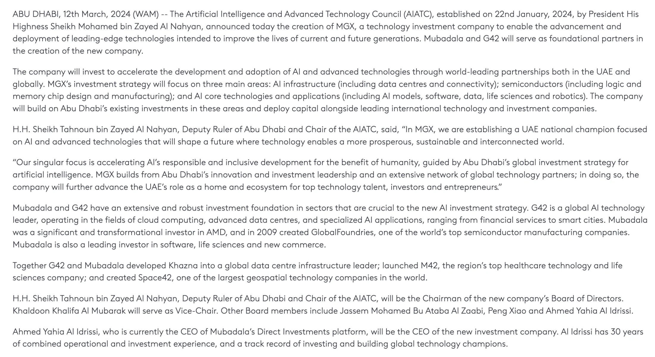 资料显示,穆巴达拉以及另一家阿联酋国有公司G42均为 MGX 创立之初的基础合作伙伴 ——维基百科对此做了更直白的解释,MGX 系由这两家实体联合发起,而这两家机构的董事会主席正是穆罕默德和塔赫农。