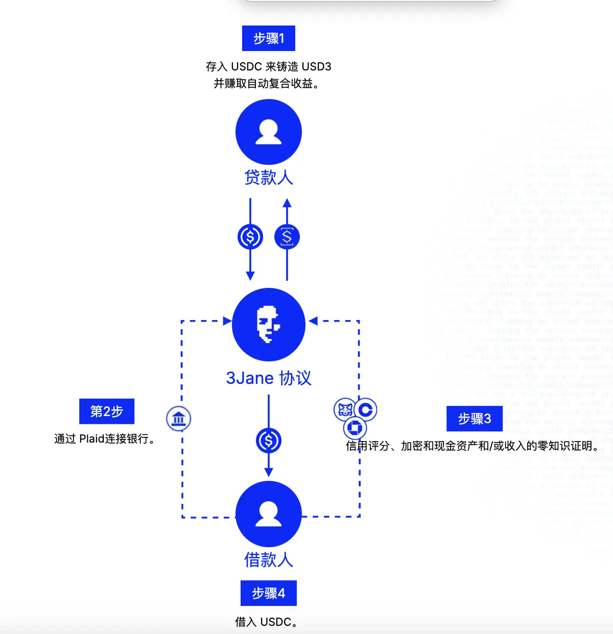 贷款人存入USDC,换成USD3(稳定收益)或sUSD3(高收益但风险更高),借给借款人。借款人通过连接钱包和银行账户完成链上和链下的信用认证,在3Jane快速评估后得出信用分数,并拿到无抵押信用额度。