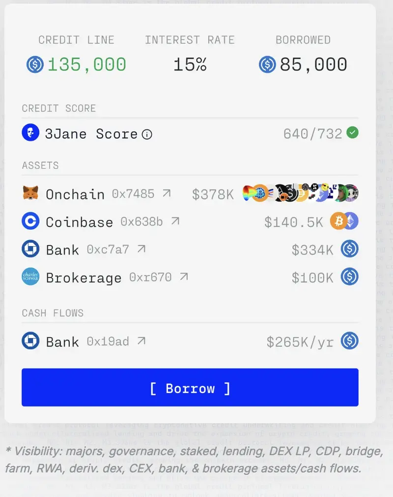 据白皮书,3Jane最终将建立在以太坊生态,其目标受众为加密原生用户(比如收益农民、交易员、商家、AI代理),靠信用评估未来现金流、链上链下资产和信用评分来放贷,使他们通过无抵押贷款解锁资本效率。
