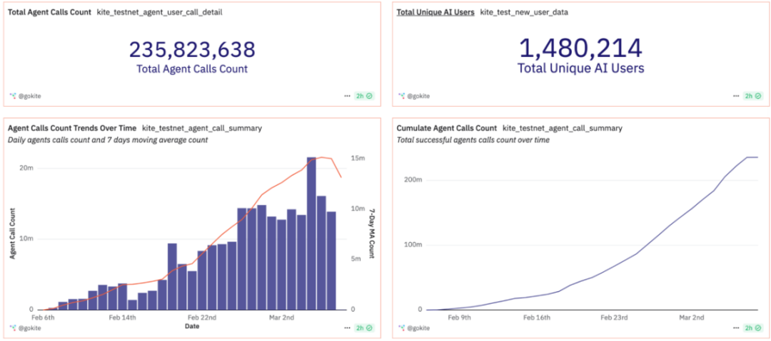 Kite AI于2025年2月6日推出了激励测试网,这是首个AI原生Layer 1主权区块链测试网。测试网上线后表现亮眼: