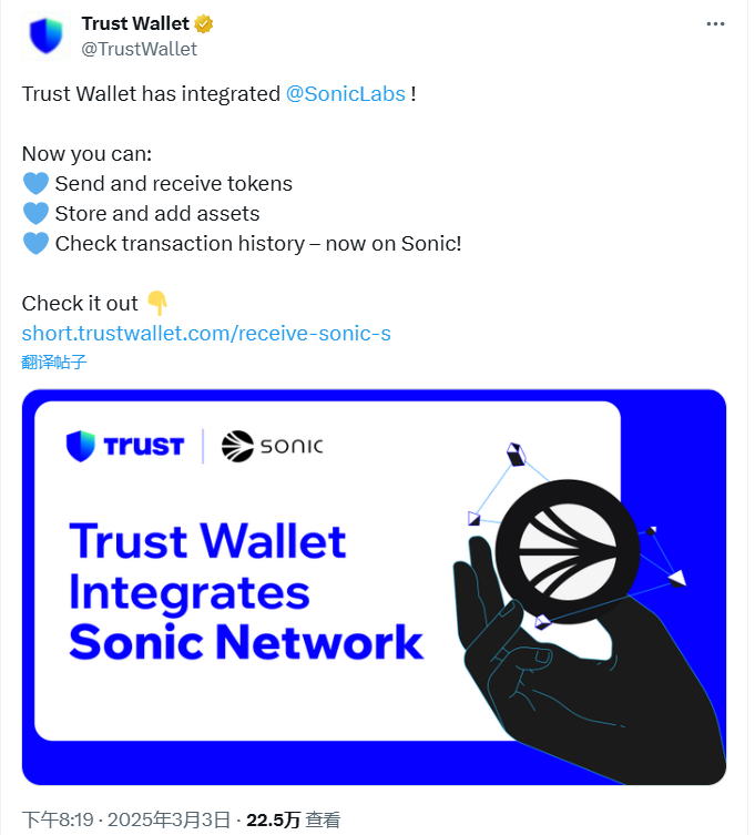 Trust Wallet 也宣布集成 Sonic (S) ,用户可在钱包内管理 Sonic 链上的资产,包括发送、接收和存储原生 S 代币及基于 Sonic 发行的代币。
