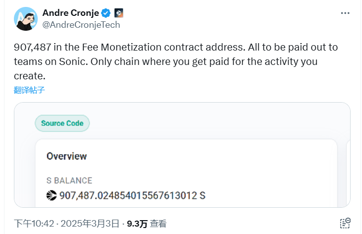 FeeM:分配给网络上产生费用的项目已超 90 万枚 $S,价值超 50 万美元。