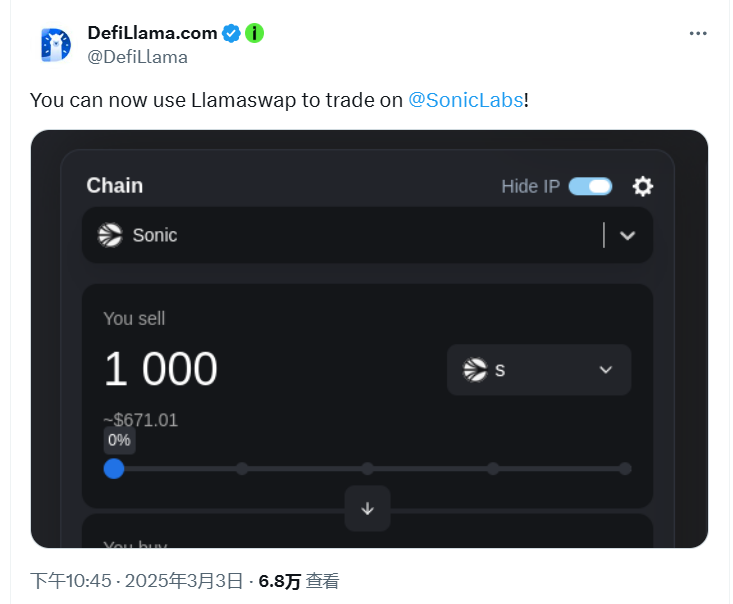 Llamaswap:DefiLlama 将 Sonic Labs 添加到支持的链列表中。用户可使用 DefiLlama 更有效地兑换代币。