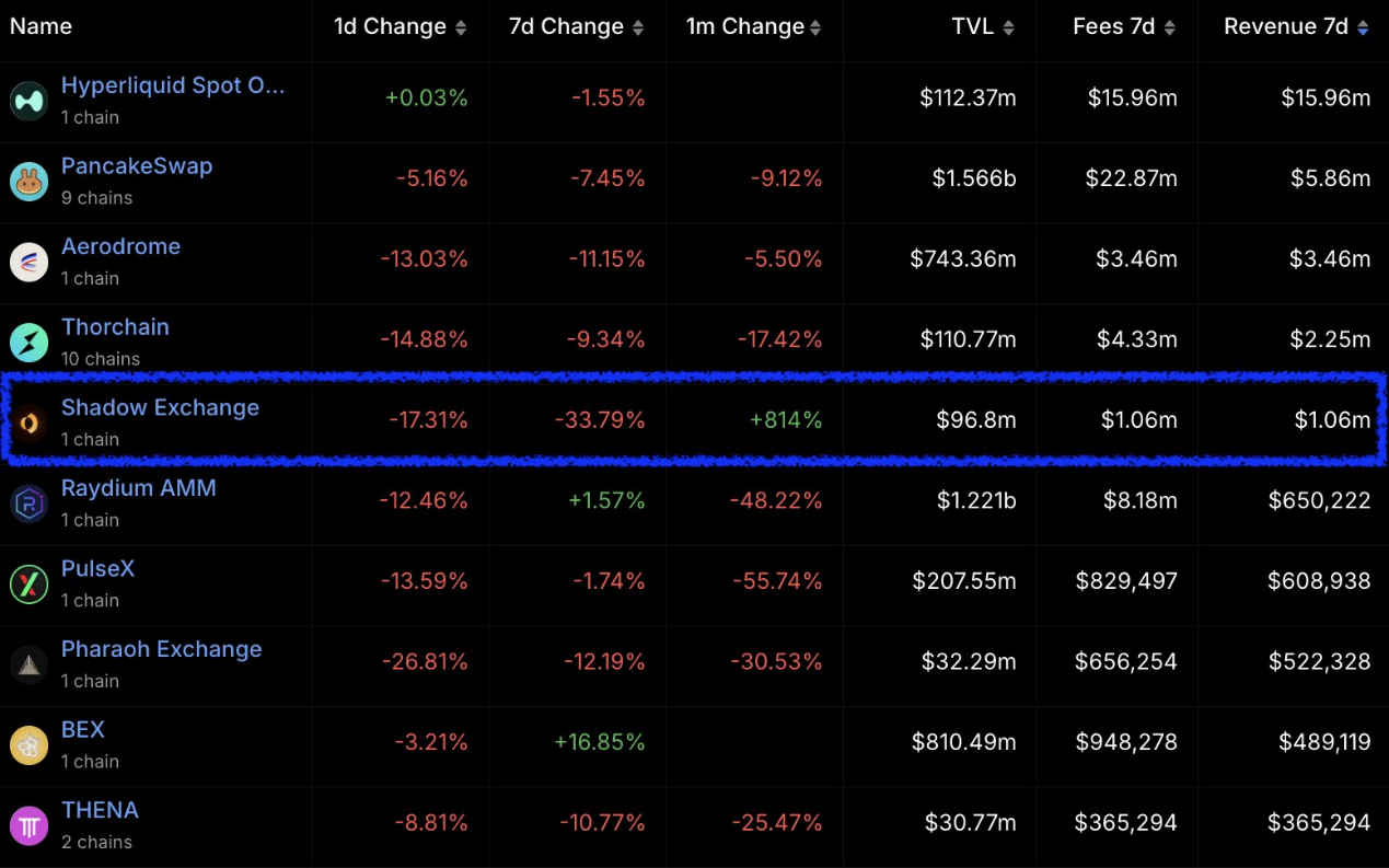 Shadow Exchange :Shadow Exchange 是一个 DEX 平台,其采用了上轮周期中热门的 (3,3) 模型,并允许用户在其池中获得高于平均水平的 APY 回报。Shadow 也是过去 7 天内收入排名第 5 的 DEX。
