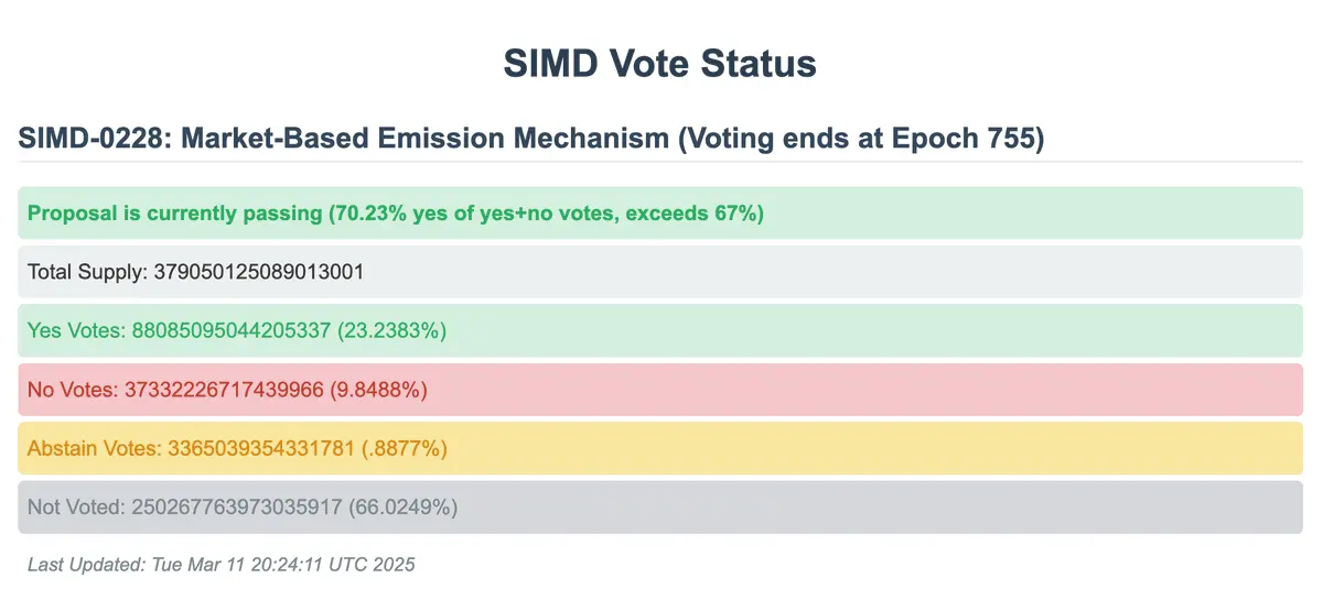 @solana SIMD 228 提案已达到法定人数,70%的人投票支持。投票将在第 755 个纪元结束,大约 52 小时之后。