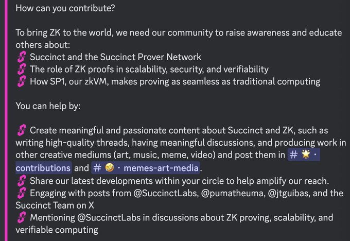 1):创建有关 Succinct 和 ZK 的有意义和热情的内容,例如撰写高质量的帖子、进行有意义的讨论以及使用其他创意媒体(艺术、音乐、模因、视频)制作作品,并将它们发布在 contributions 和 ・memes-art-media :Succinct: 在您的圈子内分享我们的最新发展,以帮助扩大我们的影响力。
