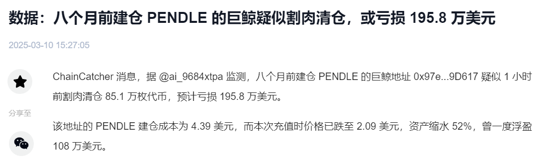 而从投资的角度来看,本轮周期下,一些坚持固有投资思维的老韭菜似乎也吃了亏,尤其是那些坚持将自己的投资重点全部放在山寨币价值投资策略上的一些老韭菜。前几天,还看到一个比较有代表性的报道,说是某个巨鲸八个月前建仓了 PENDLE,但坚持到这个月的时候似乎坚持不下去了,目前可能已经割肉清仓。如下图所示。