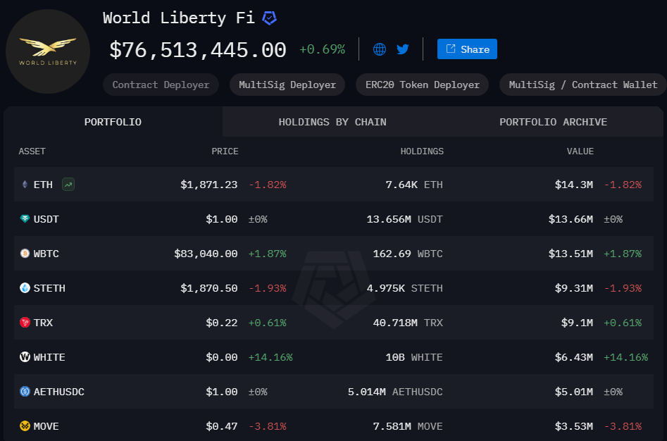 当然,除了比特币外,其他一些山寨币也开始受到一些机构的青睐和布局,比如今年开始备受关注的 WLFI(World Liberty Financial、特朗普家族支持的DeFi 项目)今年以来就一直在买入(也不排除部分代币是接受的赞助) ETH、ONDO、MOVE、ENA、LINK、AAVE 等代币。如下图所示。