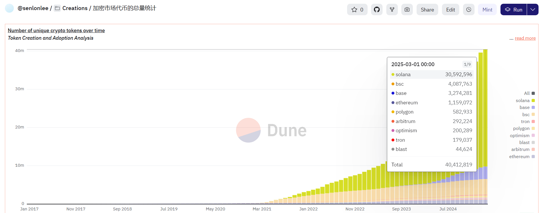 比如,2021 年 3 月份加密市场一共有 35 万种代币、而到了 2022 年 3 月份市场上有 400 万种代币、2025 年 3 月份代币总量已经超过 4000 万种。按照目前这种速度发展下去,估计到 2026 年市场中的代币数量可能就会超过 1 亿种。如下图所示。