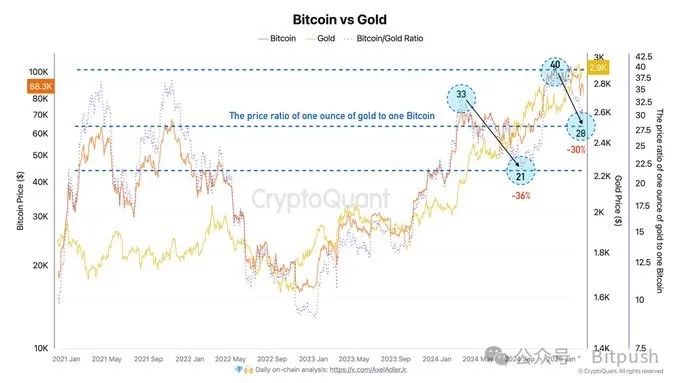 分析师认为,虽然当前的宏观经济形势不稳定,但黄金的价格相对稳定。基于上一个周期的经验(下跌 36%),如果当前的比特币兑黄金比率从历史最高点下跌的总幅度达到 36%(目前已经下跌 30%,再下跌 6%),那么这可能预示着比特币在本轮宏观周期中可能已经接近或即将触及一个阶段性的底部(local bottom),这可能就是一个买入信号。