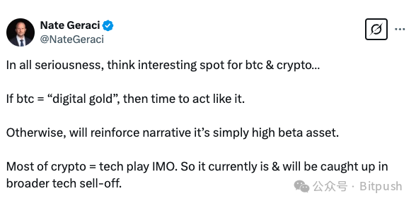 也有市场观察人士指出,比特币的表现更像是一种被过度美化的科技股,而非数字黄金。ETF Store总裁Nate Geraci在X平台上表示:“如果比特币等于‘数字黄金’,那么它应该表现得像黄金一样。否则,这将强化比特币只是一种高波动性资产的说法。在我看来,大多数加密货币等同于科技股,因此它们目前并将继续受到科技股抛售的影响。”