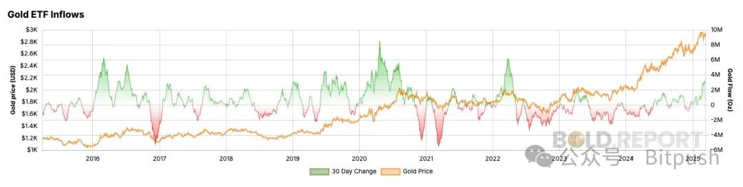 如今风水轮流转,Bold.report 数据显示,黄金ETF在过去30天内录得自2022年初以来最大的资金流入,增加了300万盎司的黄金持仓。