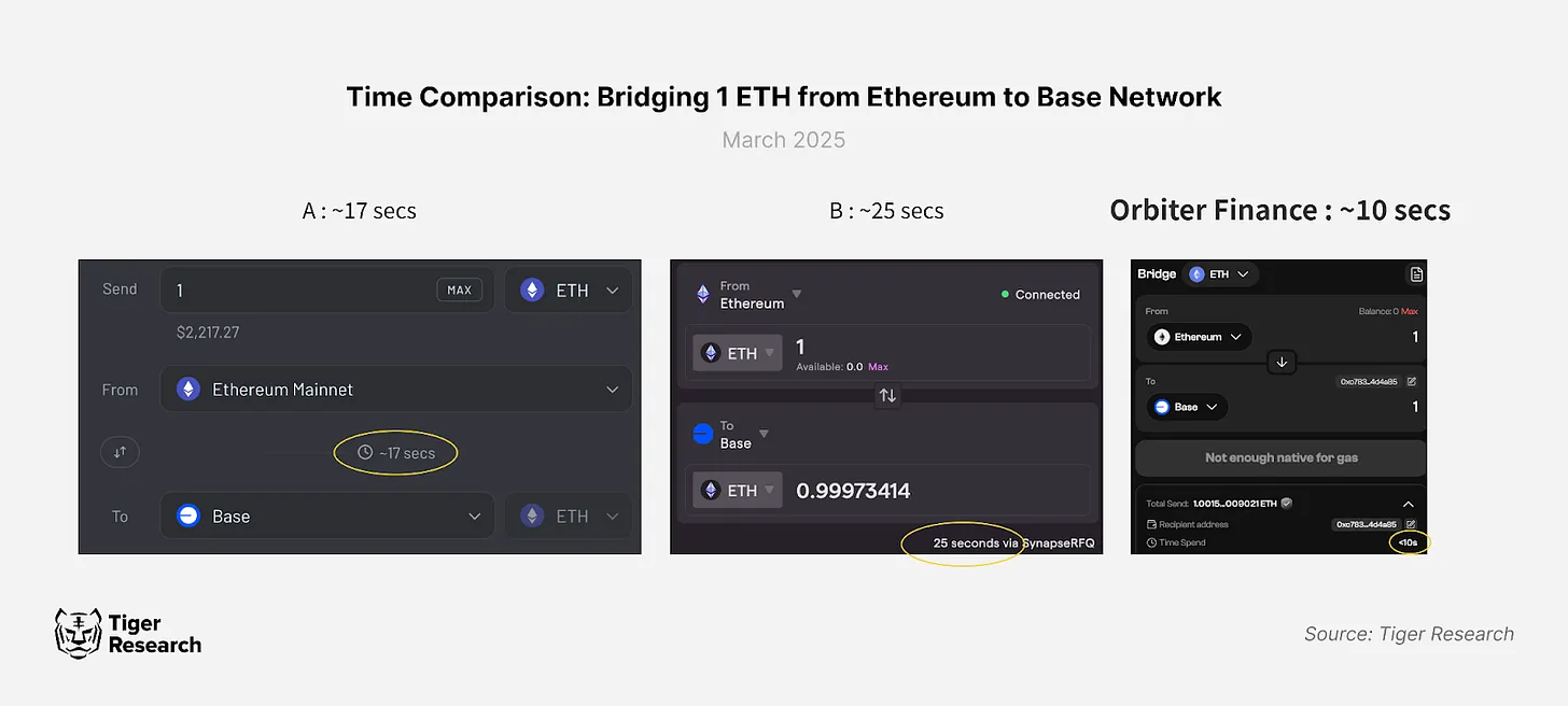 Orbiter Finance提供行业领先的交易速度,跨链转账通常在10-20秒内完成——相较其他跨链桥具有显著优势。此速度优势主要源自ZK-SPV技术与精简传输机制,最大限度减少区块确认需求。