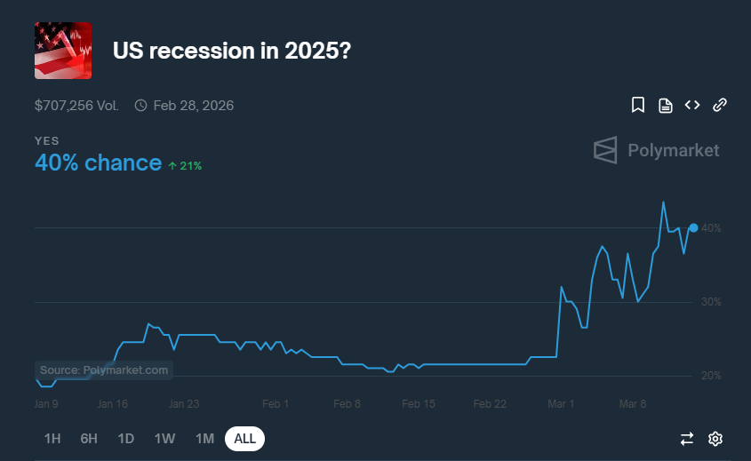 纳斯达克指数遭遇 2022 年 9 月以来最大单日跌幅,技术股和银行股连日重挫,消费者的支出意愿以四年来的最快速度萎缩。法新社直言,金融市场与特朗普的「蜜月期」已结束。摩根大通将今年衰退概率从 30% 上调至 40%,高盛从 15% 调整至 20%,Polymarket 上 2025 美国衰退的概率也来到了 40%。