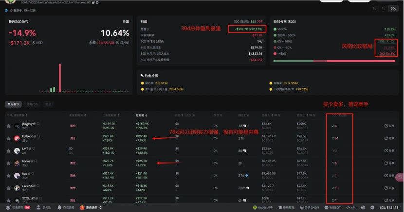 这个地址有特别多的高赔率,高盈利代币,$fullsend 能获利 78x 就不是简单人,加之别的代币也有不错的获利。再谈谈交易风格,这个地址的交易风格比较格局,浮亏 50% 以上的代币居多,并且出手特别少,交易一个代币要么拿到高赔率,要么格局到零。这样独具特色的地址可以标记起来,极其适合收藏和跟踪的。