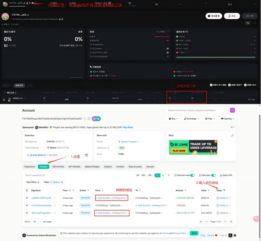 特征: 这类地址在 top 10-20 之内,且有代币资金转移特征(小鱼图标),可以通过 Solscan 查到源头地址。如图按照我的顺序去查看后,就能查询到是从地址 6rGLGsZZSceZ9C7jbjfqDzm2jCsraSqtPUmY4HopvV1U 转移过来的。像这样的地址,极大概率是筹码地址,值得记录筹码,不值得作为聪明钱包追踪。