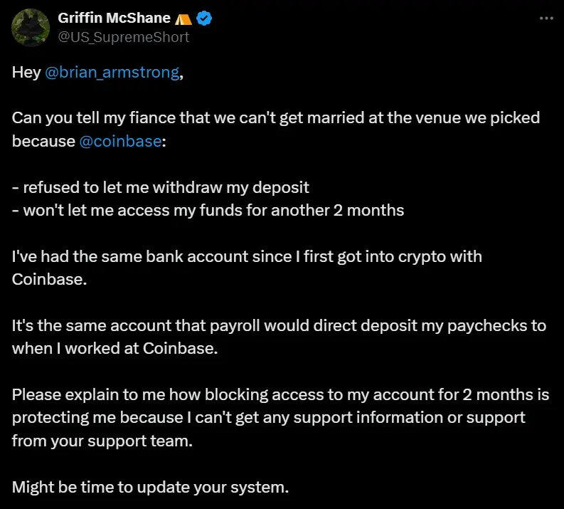 Coinbase 的激进安全策略并非首次引发争议。2025 年 1 月,一名前 Coinbase 员工公开指控其账户被无故冻结两个月,导致其无法支付婚礼费用。他表示,该账户长期用于接收工资和进行加密交易,且此前并无任何异常活动。然而,Coinbase 仅以「保护用户」为由拒绝提供具体冻结原因,也未提供有效申诉渠道。这一事件迅速发酵,进一步放大了市场对 Coinbase 账户管理机制的质疑。
