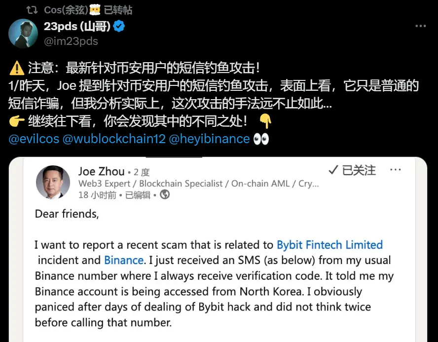 更令人担忧的是,仅一天后,安全公司慢雾 CISO 23pd 在 Twitter 上警告称,已有用户收到「伪造的 Binance 官方短信」,并且该短信出现在与 Binance 以往官方通知的同一对话线程中。这种精准仿冒的攻击方式意味着黑客可能已渗透部分第三方短信服务供应链,从而提高了攻击的隐蔽性和成功率。