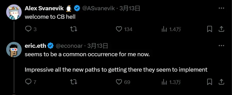 大概是苦 Coinbase 久矣,用户纷纷在 eric 的推文下展开吐槽模式。Nansen CEO Alex Svanevik 评论:「欢迎来到 Coinbase 的地狱。」管理顾问和以太坊投资者「DCinvestor.eth」表示:「我建议不要通过 Coinbase 向不属于你的地址发送资金,只需先发送到你的链上钱包,然后发送到你想要的任何地方。」