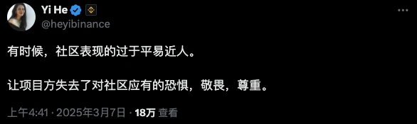 以上的行为,让币安获得了社区的一致好评,不少用户感叹“加密市场流动性终结者”币安终于站在了社区这一边。币安联合创始人何一也在 X 平台玩起流行梗,表达了项目方真正恐惧、敬畏和尊重的应该是社区。