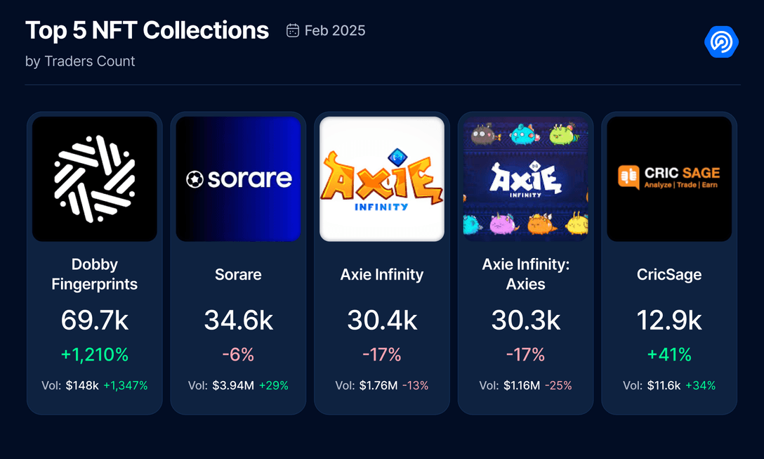 2 月份,与游戏和体育相关的 NFT 在交易活动方面表现突出。虽然头像(PFP)类 NFT 通常占据主导地位,但游戏类 NFT 的交易量排名第二,达 4100 万美元,交易了 421,853 笔资产。ImmutableX 发挥了核心作用,处理了 72% 的交易。《Guild of Guardians》和《Gods Unchained》等系列继续推动大量交易活动,反映出其在游戏社区的持久吸引力。