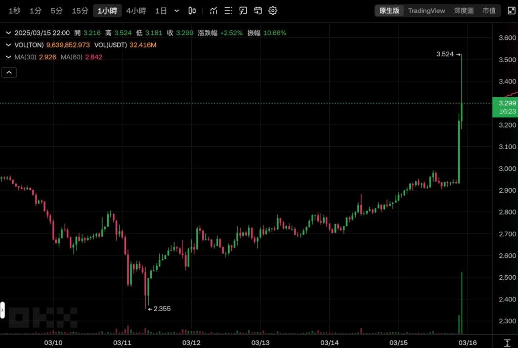 在 Durov 离𫔭法国的消息释出后,TON 代币在一小时内跳涨 20% 最高来到 3.524 美元。截稿前有所回落,暂报 3.299 美元。